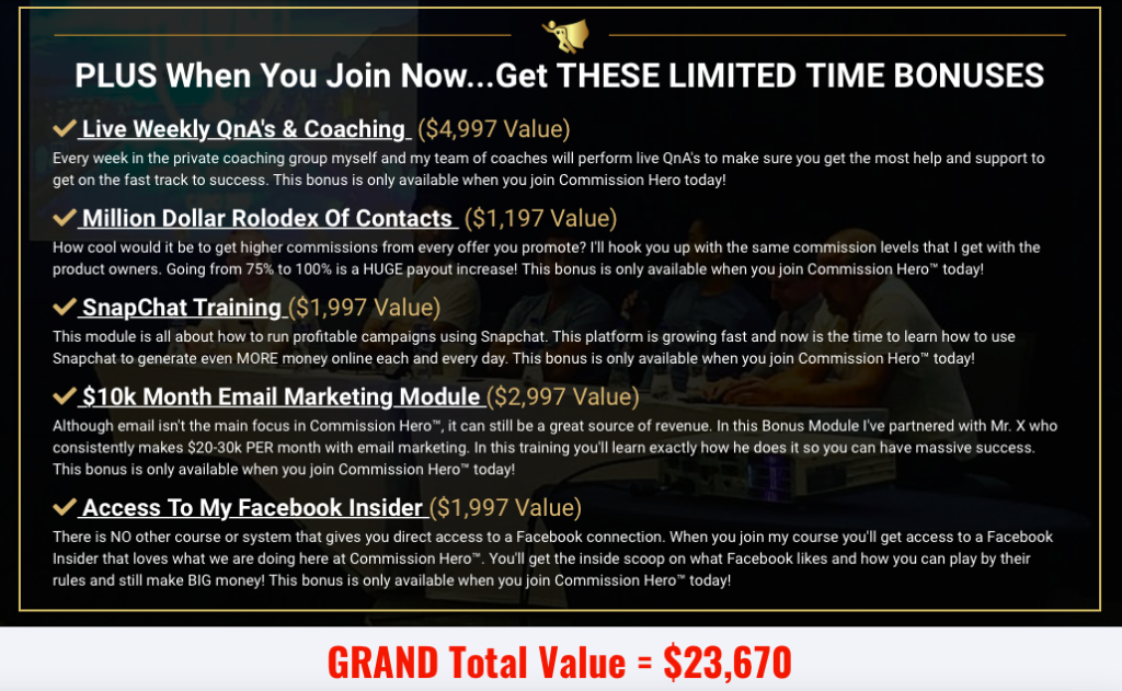 At the start of the article, we explained that most of the programs and/or products being sold have no real value. No one is buying it from you meaning it is essentially worth zero dollars the minute your credit card is charged. Scammers know this and it is why they assign massively inflated values to their add-ons and bonuses. Here are the entirely egregious Commission Hero product values.
