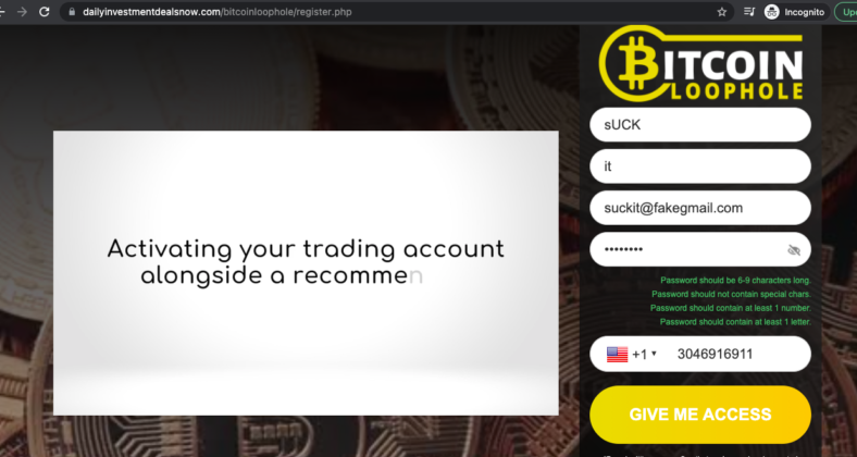 Oh, and you never hear about Bitcoin Loophole again at this stage. There is no system or platform. It’s simply a marketing tool used to trick people into providing their contact details. You’ll never, ever use this to make money.
