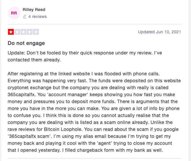 There is only one real review of the Bitcoin Loophole scam on Trustpilot. This is it:
