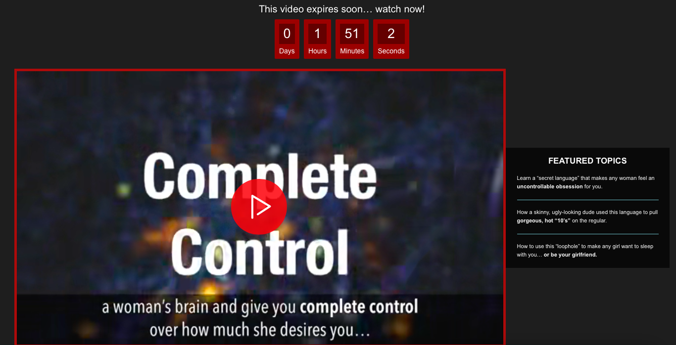 Speaking of The Obsession Method, it is a total scam. There is the scam video at the top of the landing page talking about hidden secrets and other nonsense. It’s just like the Scrambler, the F Formula or any of the other crappy dating programs we have looked at, only much, much worse.
