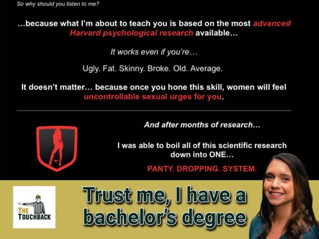 However, Spring is worse than Kinrys on just about every level. She is the Hydrox of pickup artists. And that book she peddles, The Obsession Method, is a total scam. Of course, you’re probably wondering what makes Kate Spring the worst internet dating coach we’ve seen. We’re glad you asked.