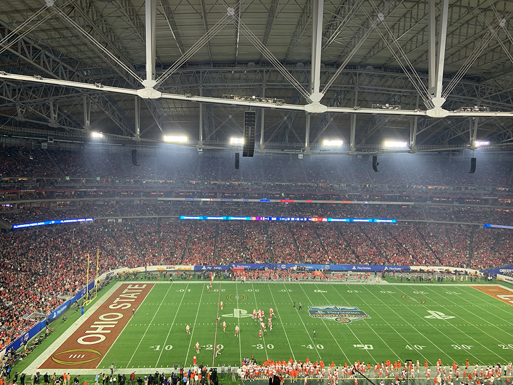 Before we kickoff this State Farm Stadium terrace level review, let’s talk about the location of the venue which catches people off guard. It’s a 25/40-minute drive from downtown Phoenix, which seemed to surprise a lot of people attending the 2019 Fiesta Bowl as hordes of Clemson and Ohio State fans kept talking about the distance.
