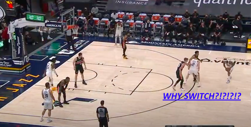 There is no reason to switch on this pick and roll. None whatsoever. It’s not like this is some fast-developing play. Joe Ingles slowly trots over to set a pick on Keldon Johnson. Everyone sees it coming from a mile away and has an eternity to react. What’s more, there is plenty of space to go over the top of the screen. Plus, Jordan Clarkson is basically at a full stop. It would take no extra effort for Johnson to avoid the pick and he wouldn’t be at a defensive disadvantage.
